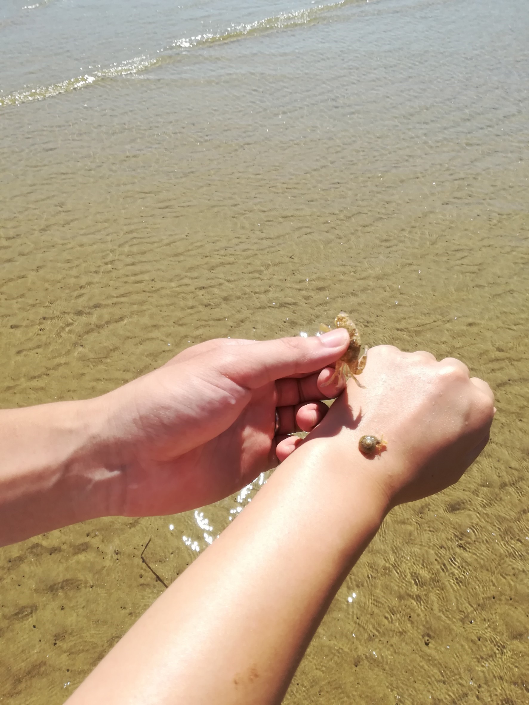 誰一人いない海。水着になる勇気もなく、カニ探しに没頭し、昼寝していたら、おじいちゃんが閉めるよと言ってきたので退散。