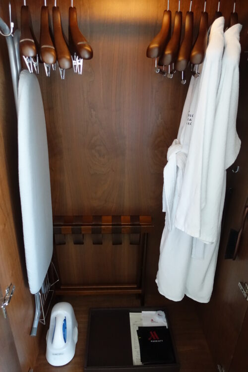 部屋の空間を大きくするためか、玄関側にホテルの資料とパジャマを置くレイアウトにしてあるようです。