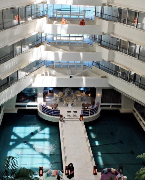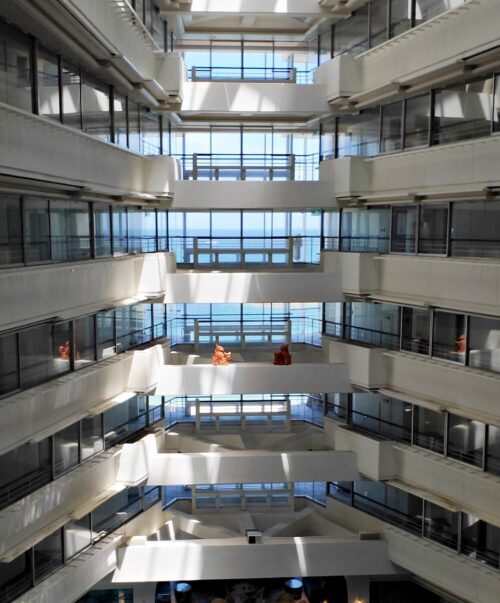 その三角錐の面に沿って部屋が配置されているため、各階の廊下から底面であるロビーを覗けます。